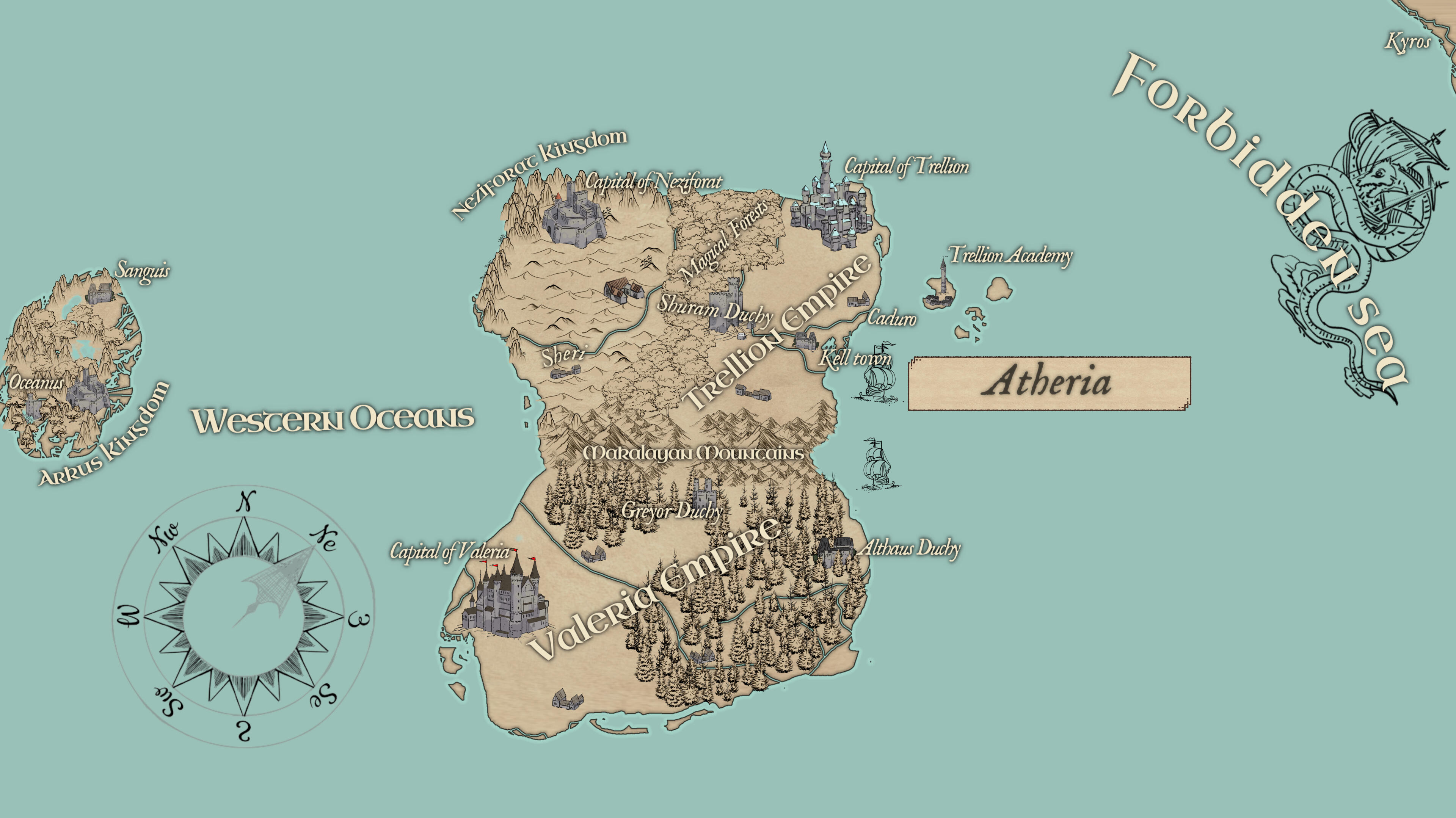 Atheria is a continent teeming with life, unlike any other, set in an era defined by magic, opulent regency, and political intrigue. This world is rife with perilous royal machinations, dragons, and century-old feuds between empires, where power is both coveted and contested.At the heart of Atheria’s enduring prosperity are three pivotal nations—the mighty Empire of Valeria, the enigmatic Empire of Trellion, and the sacred Kingdom of Neziforat. Each of these realms plays an indispensable role in shaping the continent’s future.Once the undisputed ruler of all Atheria, the Kingdom of Arkus now resides in an independent archipelago off the western coasts. Though it no longer holds sway over the entire continent, the remnants of its former glory still burn fiercely within the hearts of its draconic rulers, who long for the day they might reclaim their dominion.Though, whose to say that the world isn't already in the hands of the gods?