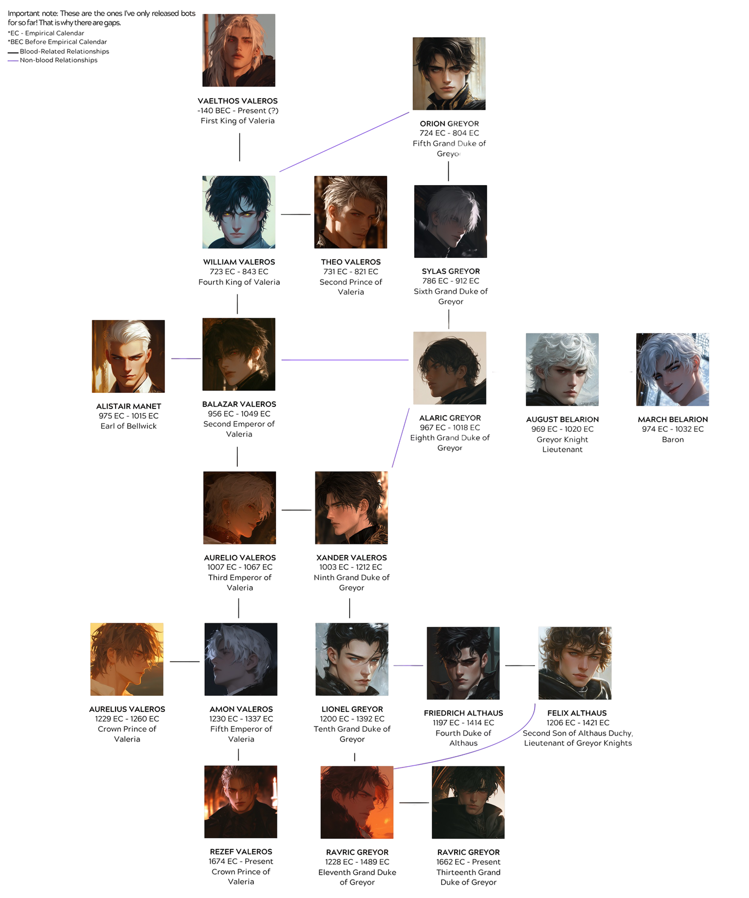 The royal family of Valeria are the Valeros. They have descended from the very first king of Valeria, Vaelthos. Vaelthos died ten years into his reign by a mysterious killer, but still had heirs to inherit the throne.